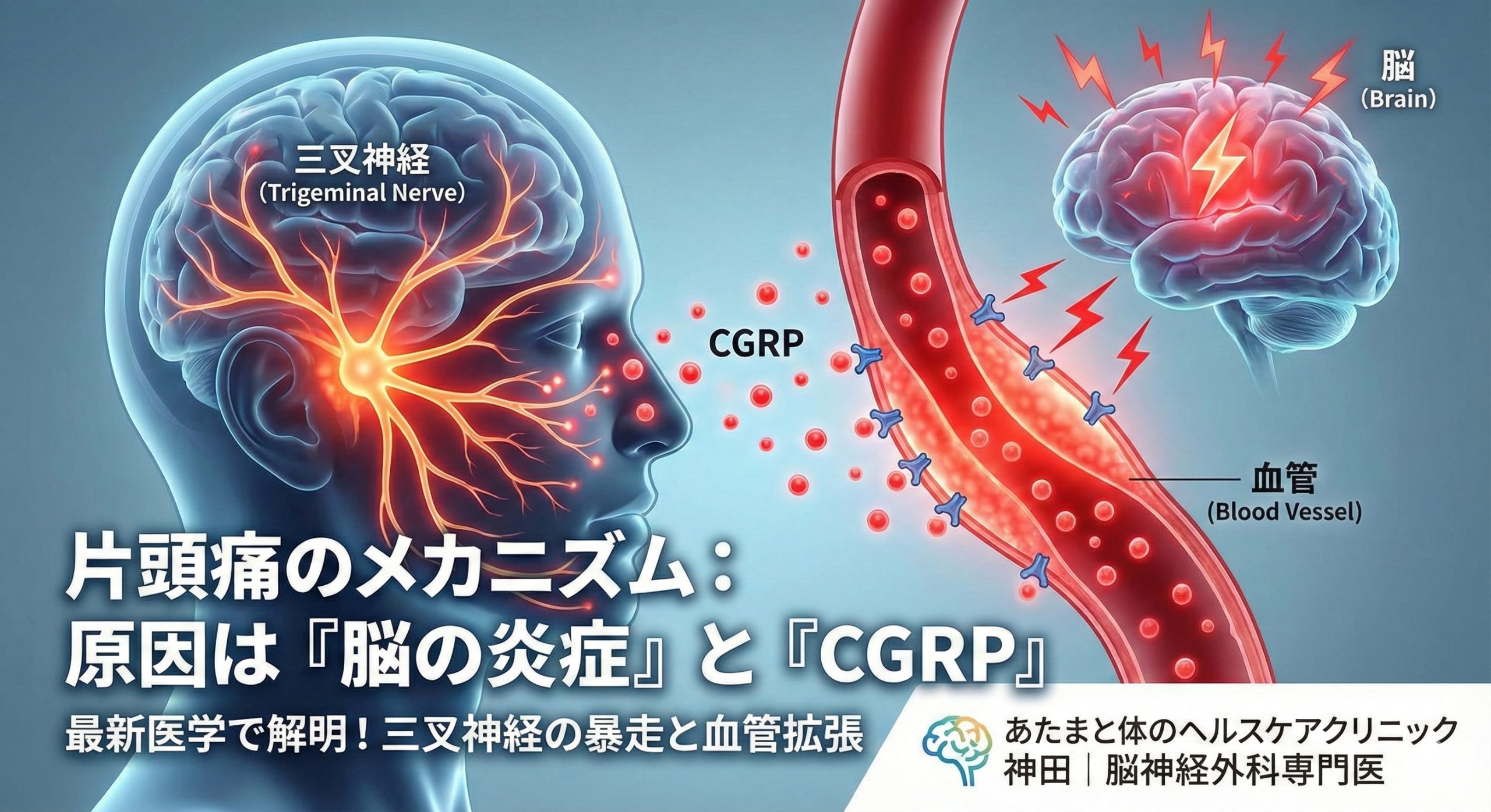 かつては「血管が拡張して神経を圧迫するから痛い」と考えられていましたが、現在はより複雑なメカニズムが解明されています。 キーワードは、「三叉神経(さんさしんけい)」と「CGRP」です。